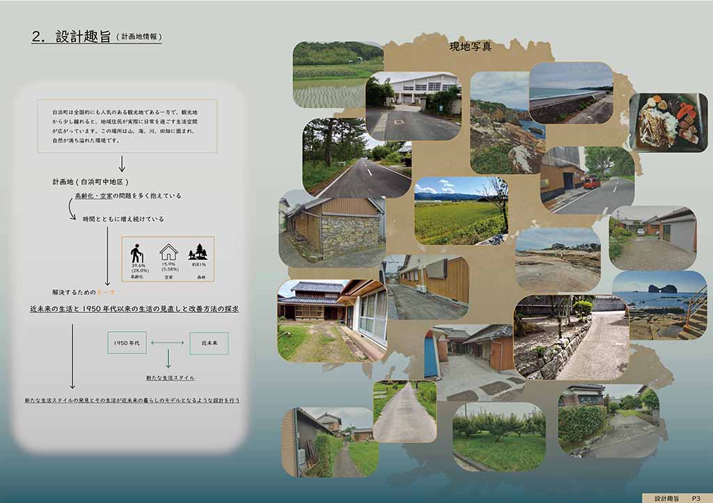 近世、全国的に問題化注視を避けがたい、「限界集落」「過疎地における今後の展望」の解決策として、地域を限定して学生らしく提案した作品。