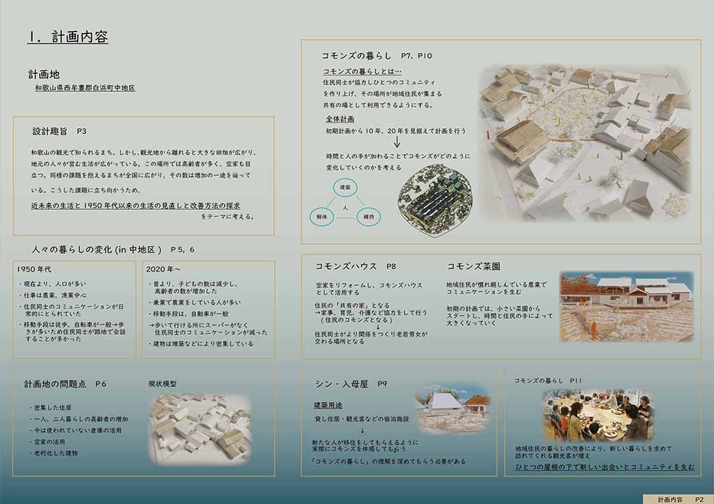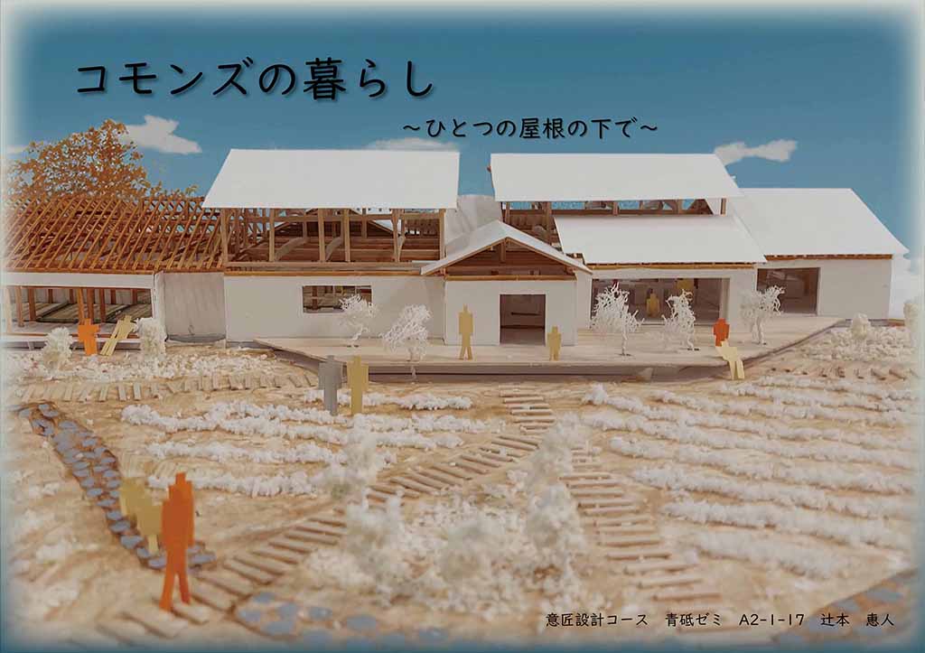 7月から12月まで半年間、コツコツと住民のアンケート調査を含む現地調査を踏まえ、計画を継続して、多くの図面やスタディー模型等の作成は秀逸である。農作業を介して「コモンズ=共有」を軸に時間の経過を見込んで、今後の近未来の村の「近代の里山の暮らし」を提案している。