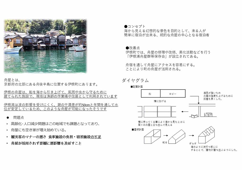 京都府の「伊根の舟屋」という特徴のある地域と建物を計画地にし、その魅力をより高めるとともに問題点にも着目して調査を進めながら、プランの作成をしていた。軸組模型に苦戦していたが友人の応援も得ながら作り上げており、自身で良い製作環境づくりができていたと思う。過程の前半に時間がかかってしまっていたが、後半はスパートをかけて最後はしっかりと白模型の完成まで持っていったことも評価したい。 <岡﨑 祐介>