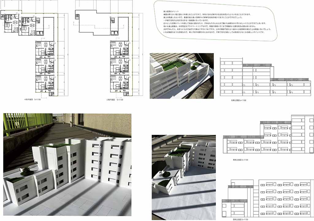 住み慣れた地元を計画敷地に設定し、馴染み深い用途の共同住宅を計画建物とすることは、日頃から建築学生としてしっかりと問題意識を持って日常生活を送っている裏付けであると推察します。壮大な思想表現ではなく非常に現実的な目線を持った本計画案は、設計職を志す制作者にとってこの上なく有意義な思考の訓練であり、2年間の学習成果が表れています。 <福山 亮介>