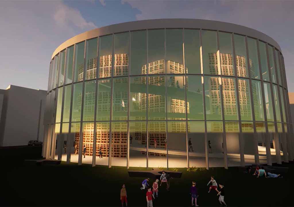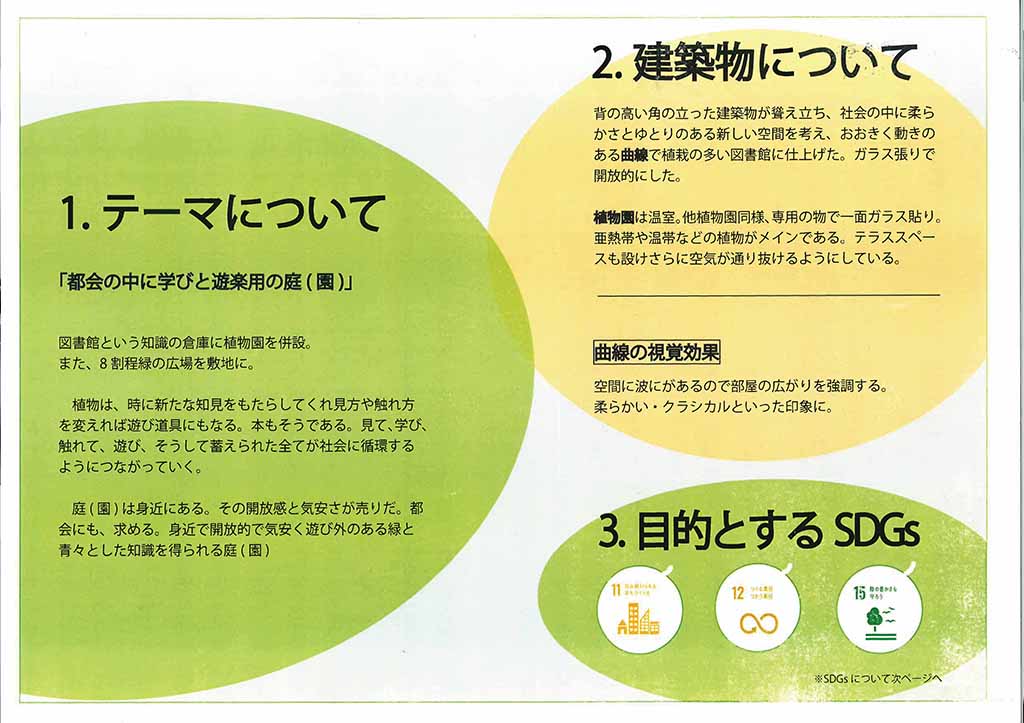 これをテーマとし、図書館そして屋上に温室植物園とテラスを計画しています。ここに展示される植物は生息域外保全と滅危惧種の栽培といったSDGsへの取り組みを行います。さらに、開架書庫やエントランスに緑を取り入れることで緑との共存空間が生まれます。また、この図書館では古本も一部取り扱いするようになっており、本も植物も循環する環境にもなっていくようにと計画しました。この図書館では差別化として2階開架書庫から本を持ち出して3階植物園で読むことも可能にしています。