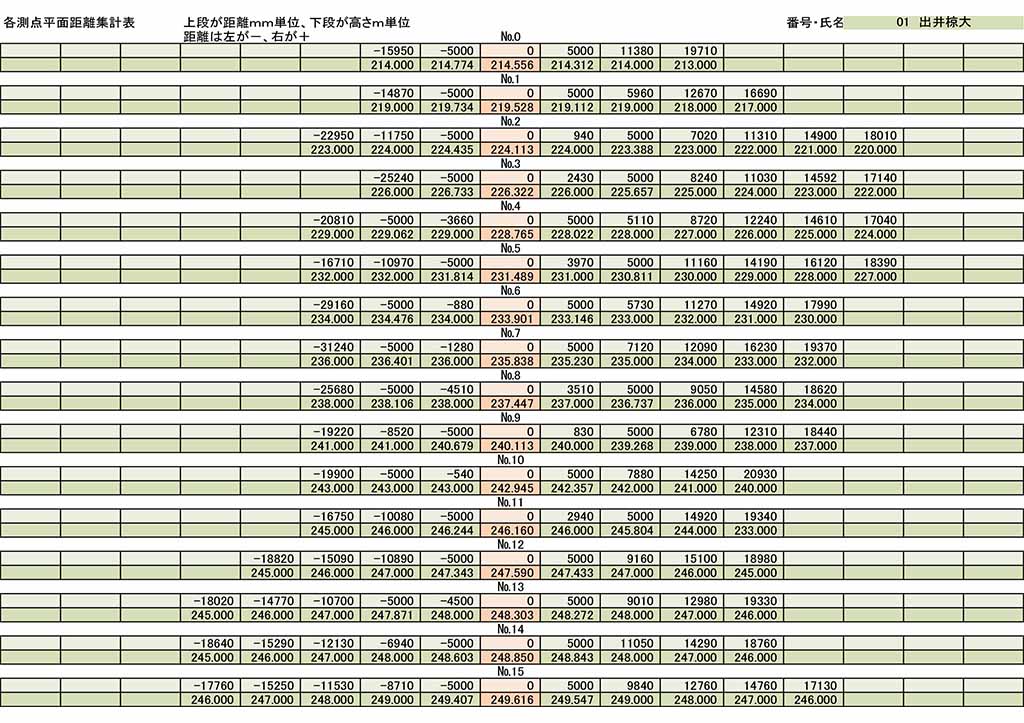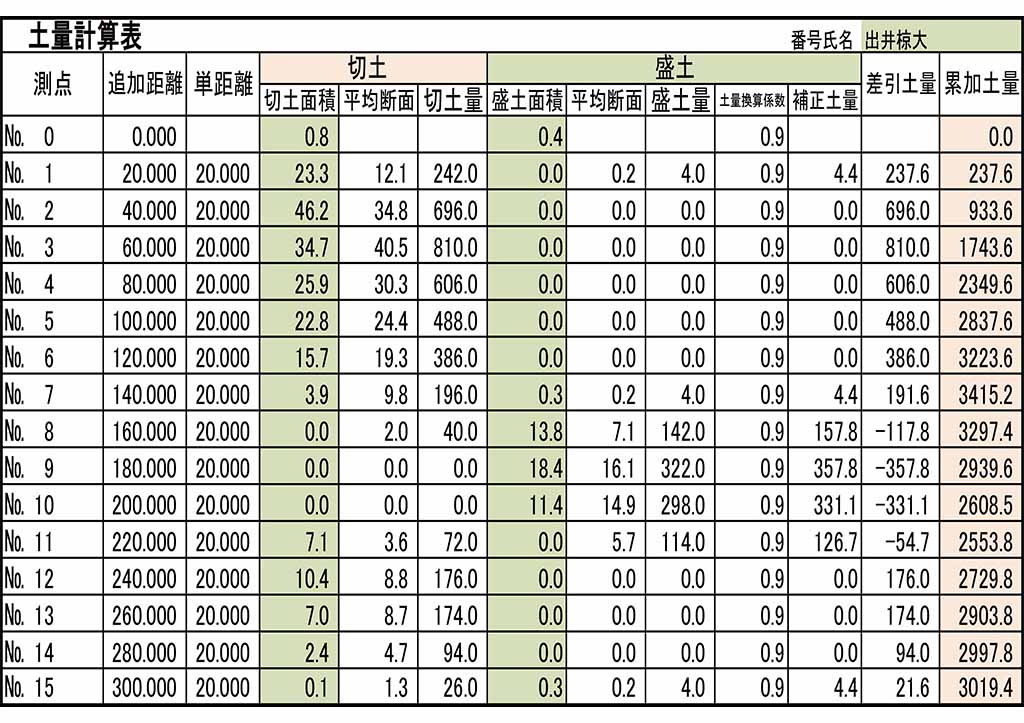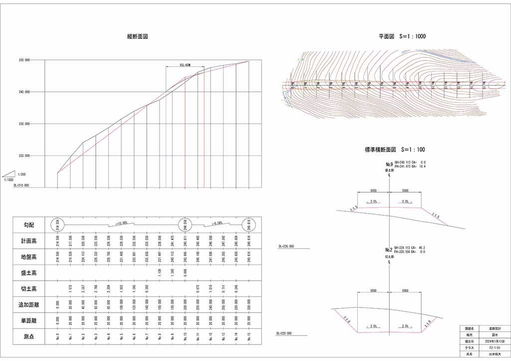 道路設計コースの道路路線設計は、入学してから学んだCAD製図、測量学、施工学などの知識を基に、地形図をもとにペーパーロケーションで等高線を読みながら、縦横断測量から土量計算までの一連の流れを実施している。この設計はこれまでの学習成果である知識を活用し、直線の道路ではあるがエクセルの計算機能やAuto CADの計測機能等を活用し道路の縦横断計画をして図面にまとめている。 <野瀬 孝男>