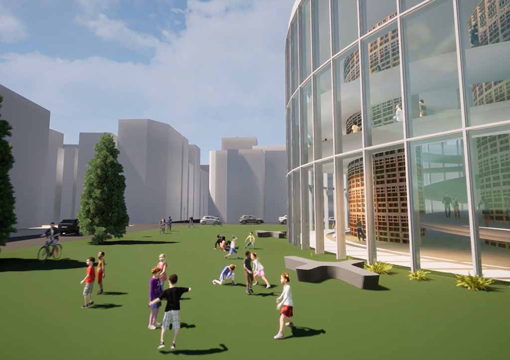 包摂的且つ安全な緑地としても全てを開放する形です。こうしてさらにSDGs 実現を目指していき、都会の中心部ですべての人が開放的な都会の中に学びと遊楽用の庭を形成します。