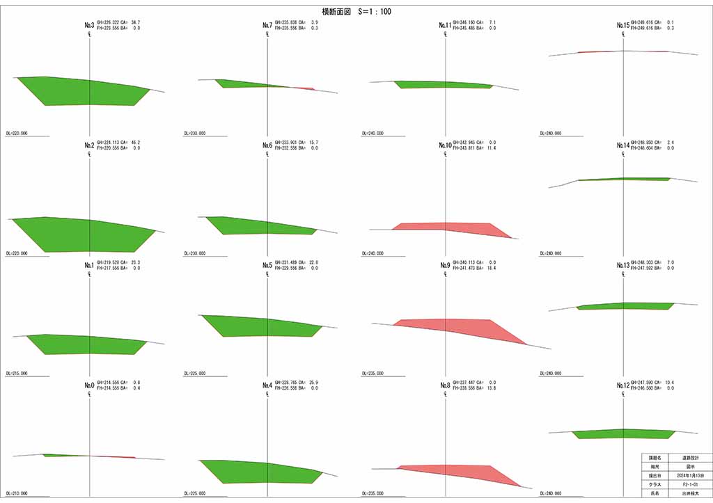 縦横断図作成後、計画縦横断を作成し、土量計算のために必要な切土面積、盛土面積をAutoCADの面積計算の機能を活用して求め、Excelを用いて土量計算表を作成。この作業で改めてAutoCADの便利さをしれた。