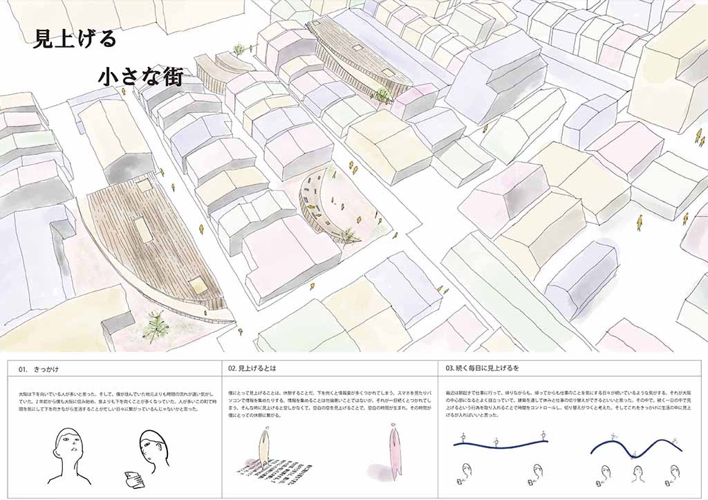 あれは2年前のことです。大阪に来てある景色に違和感を感じました。それは下を向いて人々が歩いてることです。電車や街中、帰り道でさえ忙しそうに見えて、時間の流れがとても早く流れているように感じました。これは下を向くことと関係しているのではないかと思いました。そこで、「見上げる」という小さな行為が、忙しい日々から抜け出せるきっかけになるのではないかと仮説をたて、卒業設計のテーマにすることにしました。