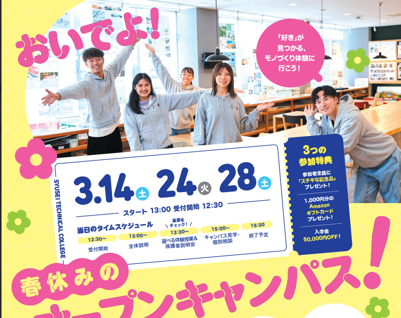 修成の概要、各学科での学びやその魅力、卒業後の進路などについてご紹介します。