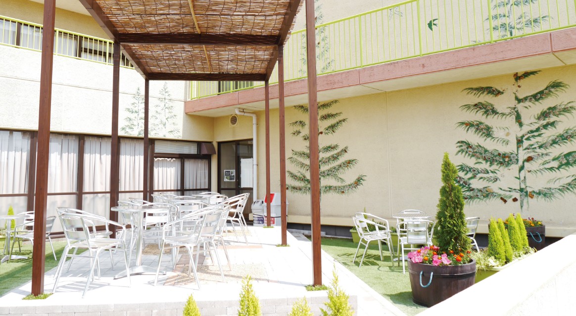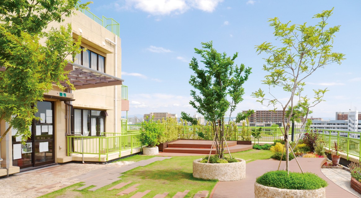 植栽のほか、ウッドデッキや芝生スペースなど休憩スペースも設けている。