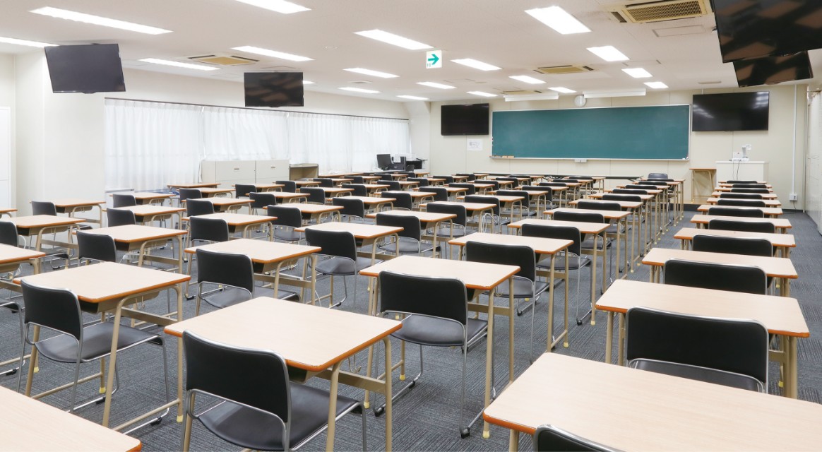 授業や各種資格試験の講習会などで使用。最大110名収容可能な教室。