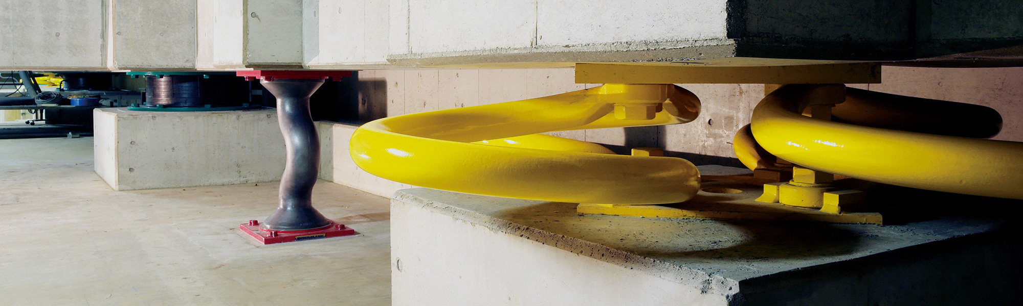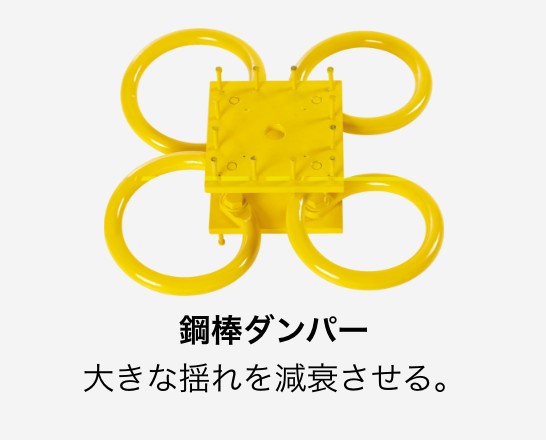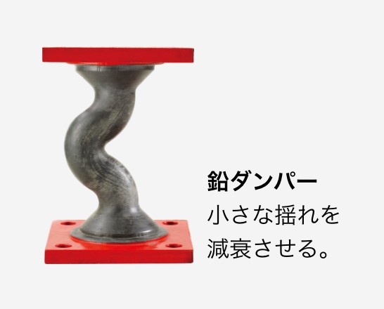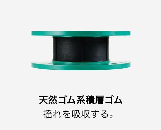 免震装置は一般的に積層ゴムとダンパー(減衰装置)の機能を備えたものの組合せで成り立っています。