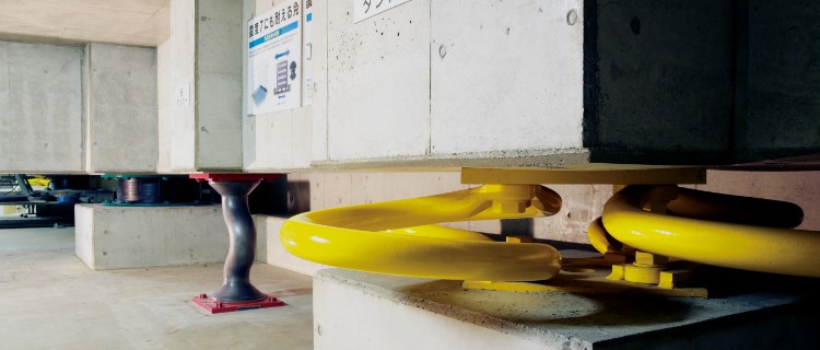 免震構造は、免震層(地下免震ピット)に免震装置を設置して地盤と建物を切り離し、地震による建物の揺れを減少させる。地震時には建物の損傷を防ぐだけでなく、ゆっくりと揺れることで家具なども倒れにくく、設備機能も維持されるというメリットがある。これらの免震装置は地下室で実際に見学できるため、「生きた教材」としての理解だけでなく「安全・安心」という建設の基本を、身をもって感じられるだろう。