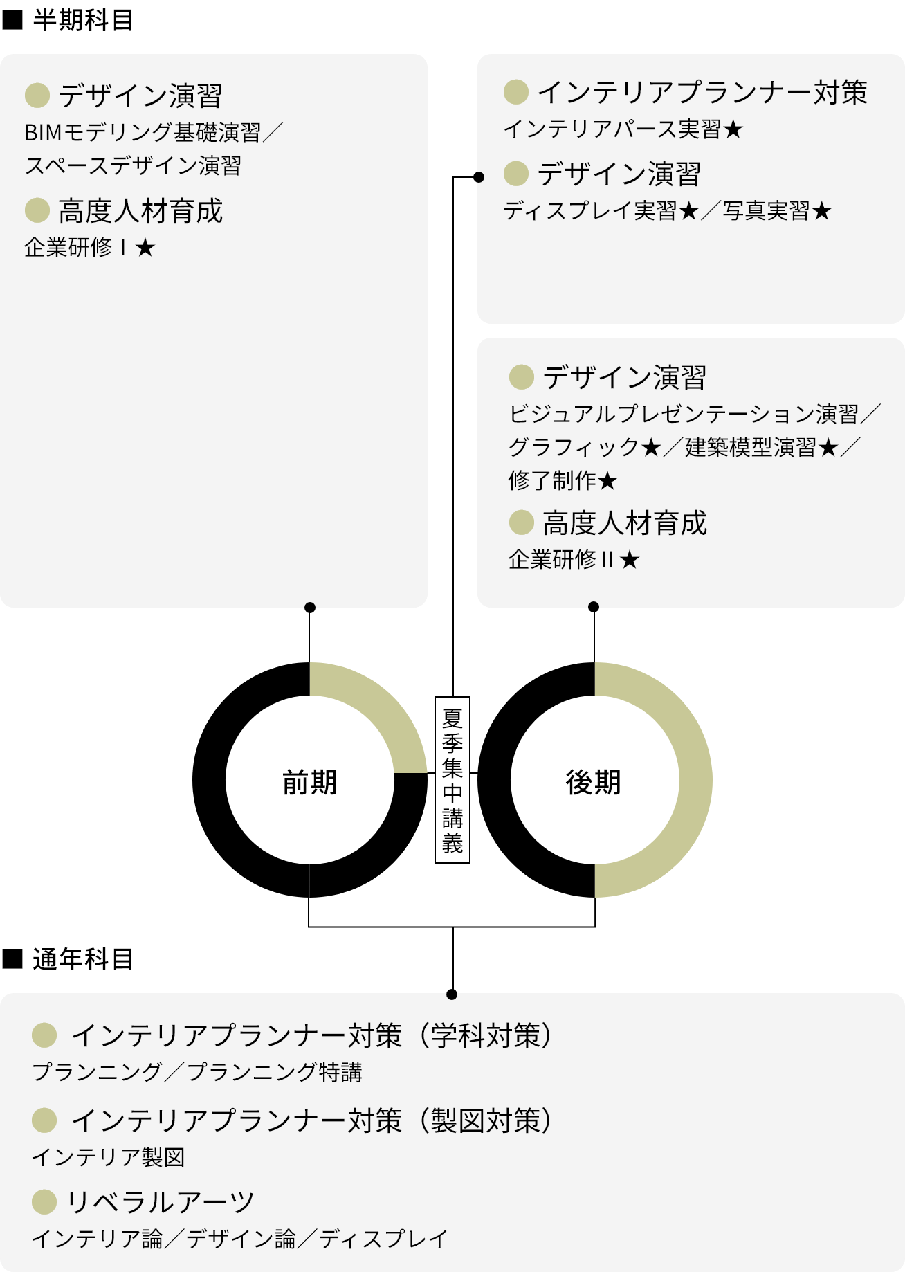 1年間を通じ、演習・座学・実習を並行して学びます。前期はBIMモデリング基礎(ArchiCAD)やプレゼン演習、デザイン論などの座学 と並行し、インテリアプランナー学科試験対策に集中。通年で第一線の講師による「スペースデザイン演習」を核に進めます。科目選択型の夏季集中講座(ディスプレイ実習など)で自身の専門スキルを強化。後期は企業研修(長期インターンシップ)での実務研修 と製図試験対策、集大成としての修了制作に取り組みます。