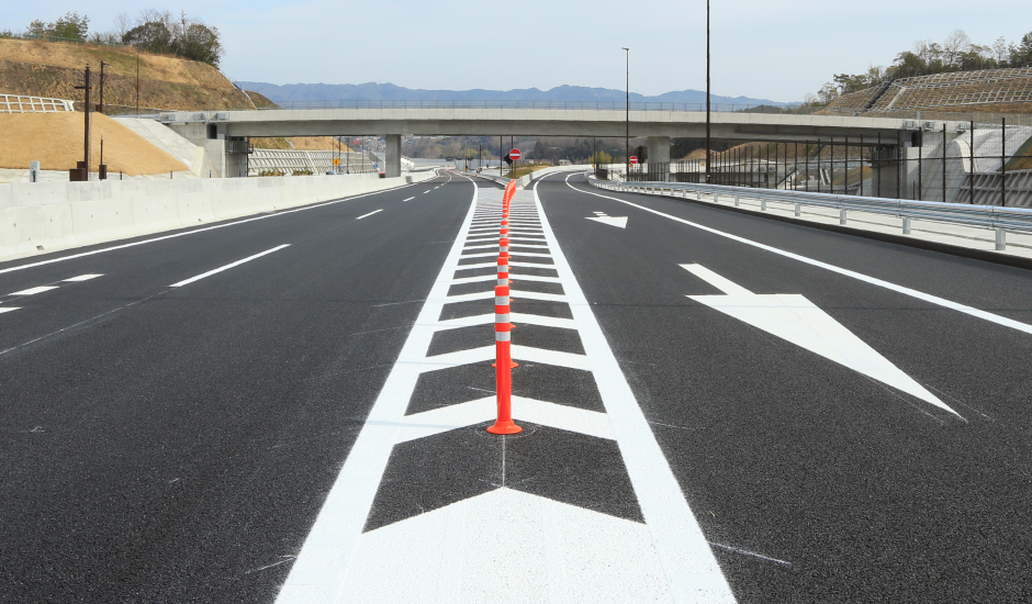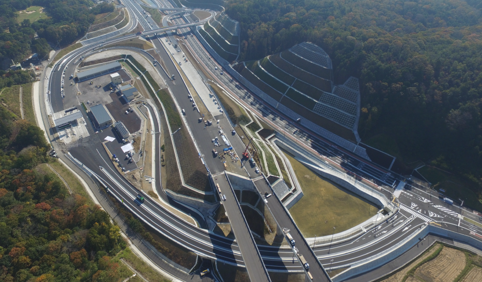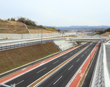 新名神高速道路(以下、新名神)は、名古屋市と神戸市を結ぶ全長約174㎞の高速道路です。1989年に基本計画が決定後、各地で工事が行われ、すでに一部が開通しています。高槻ジャンクション(JCT)から神戸JCTまでは2008年より順次施工されており、2018年3月に区間全線が開通しました。当社では新名神の川西ICならびに隣接する橋梁(きょうりょう)の下部工を築造する、施工延長1411mの道路築造工事に携わり、アクセス道路である県道川西インター線の土工事も一部担当。工期は5年10ヶ月と稀に見る長期間で、なかなか経験することのない大規模なプロジェクトです。新名神が完成することで、名神高速道路と中国自動車道の交通量が分散され、宝塚IC付近をはじめとする渋滞の緩和が期待できます。またアクセスの利便性向上で人が集まりやすくなり、観光分野の促進や企業の進出など地域社会の活性化になるとともに、大規模災害や重大事故の発生時の代替ルートが確保できるようにもなります。