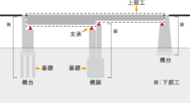 橋に人や車両が載る部分。支承より上の部分を指す。