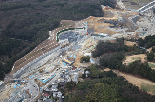 発注者は西日本高速道路株式会社(以下、NEXCO西日本)で、当社が工事に着手したのは2012年2月です。主な内容は土工事246万㎥、橋台・橋脚24基、ボックスカルバート3基。特に土工事は、近隣・遠方の土砂搬出先18箇所への運土を必要としていたため、業者間の調整や一般道路での運行管理なども行いました。施工完了後、土工部については施設や道路舗装の担当業者へ、橋梁については上部工施工業者へ引き渡す流れとなっており、私たちが期限を守らなければ各部門の工事に遅れが出てしまいます。とはいえ、自然を相手とするのが土木の仕事。実際に施工してみないと把握しきれないことが多く、事前に決められた計画どおりに進められないこともあります。だからこそ図面を正確に形にすることはもちろん、常に現場の状況を見極め、より適切な工程や工法を模索することが重要なのです。