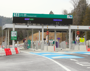 川西ICの設置場所は、西畦野(にしうねの)地区と石道(いしみち)地区の間の山間部。山を拓き、掘削するところの工事からはじめられた。ICの出入口に接続されるアクセス道路として、県道川西インター線も同時に施工した。