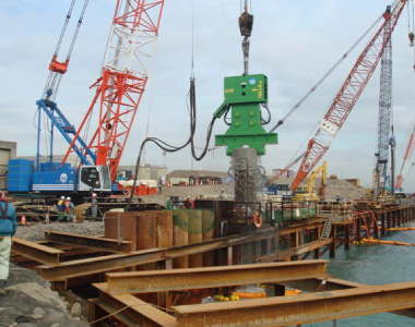 「超大型油圧式バイブロハンマー」(写真下)は、鉛直方向に振動を発生させて大きな威力を発揮することで、しっかりと杭の打込みができる。