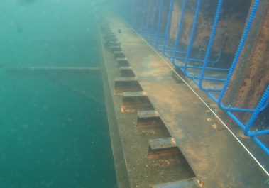 海の中は、ダイバー作業員が水中で作業。コンクリートは水中コンクリートを、鉄筋はさびを防ぐため防錆(ぼうせい)塗装されたものを使い、特殊な資材で岸壁がつくられる。