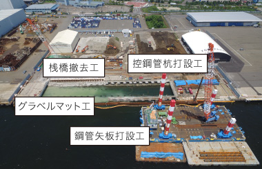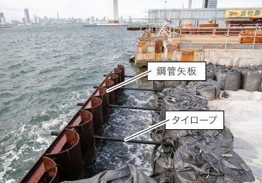 もともと、このエリアには桟橋が設けられており、桟橋を撤去後、海側と陸側に鋼管矢板(杭)を打ち込んだ。その後、杭と杭をつなぎ、タイロープ(タイワイヤー)を通して留めることで、岸壁が崩れないよう強度を高めた。