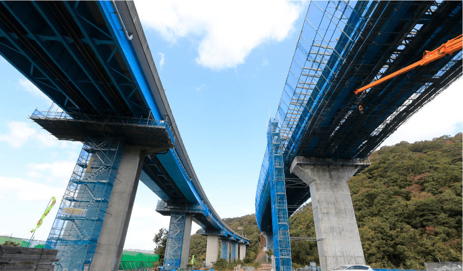 当社が担当するのは橋梁上部、いわゆる「橋桁と床版」の部分。下部工事と呼ばれる橋脚部分は別の会社が先につくっており、その上に橋桁を架けていきます。新しくつくる7つの橋のうち、5つは本線とインターチェンジ拡幅のために必要なもの、あとの2つは4車線化した湯浅御坊道路をまたぐ橋(跨道橋)の架け替えです。