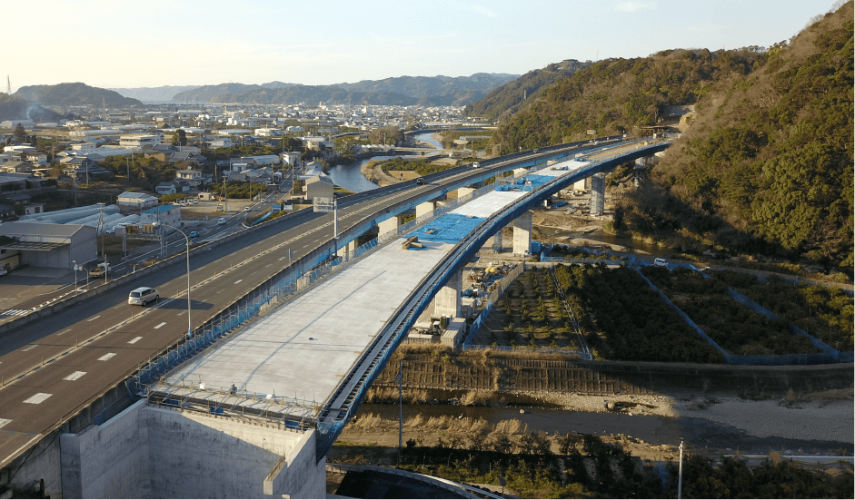 「湯浅御坊道路」は和歌山県御坊市を起点に、和歌山県有田郡有田川町にいたる総延長約19kmの一般有料道路で、1990年に2車線(片側1車線)で建設されました。その後交通量が増加し、渋滞がたびたび起こっているほか、事故が発生するとたちまち通行止めとなってしまうことが課題とされています。そのため、現在ある2車線にほぼ並行する形で4車線化(片側2車線)への工事が計画され、2010年に都市計画が決定された後、2013年に事業化、現在は2021年の開通に向けて建設が進んでいる真っ最中です。当社はそのうち広川インターチェンジから広川南インターチェンジまでの約4kmの区間で、7橋の橋梁上部工事を担当しています。
