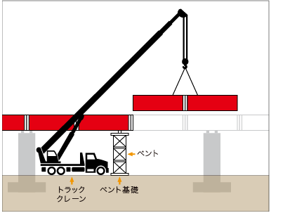 トラッククレーンを用い、橋脚と橋脚の間に仮の橋脚である「ベント」を設置。次にトレーラーなどで搬入してきた鋼製の橋桁をクレーンで吊り上げ、ベントで支えながら架設していく。他の工法と比べ工費が安く短期間で施工できるため、鋼橋架設の工法としては最も一般的。