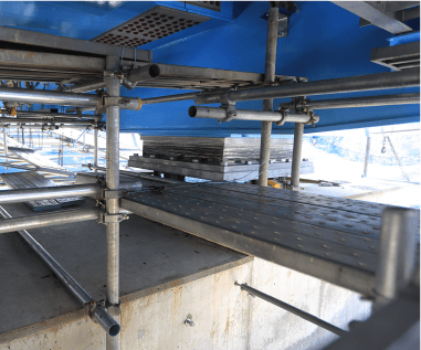 今回は「トラッククレーンベント工法」と呼ばれる架設工法で鋼製の橋を架けています。橋脚から橋脚までの距離が約60〜90mあるのに対し、1つの橋桁の長さは10数メートル程度のため、一度に橋脚間をカバーすることはできません。そこで、まずH形鋼やブレス材で組み立てられた「ベント」と呼ばれる仮の橋脚を立てます。そして、トラッククレーンで吊り上げた橋桁をベントで支えながら、順番に橋桁を架けていきます。橋桁の重さは1つ15〜20tにもなり、1つずつ架けることもあれば、地組立といって、地上であらかじめいくつかの橋桁をつなげてから吊り上げることもあります。このトラッククレーンベント工法は他の工法に比べて費用が抑えられ、工期も短くできることから、鋼製の橋を架ける工事では最も一般的な工法です。橋桁を架けた後、床面のコンクリートを打つ工事まで当社で行っています。