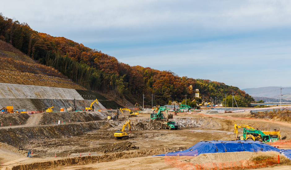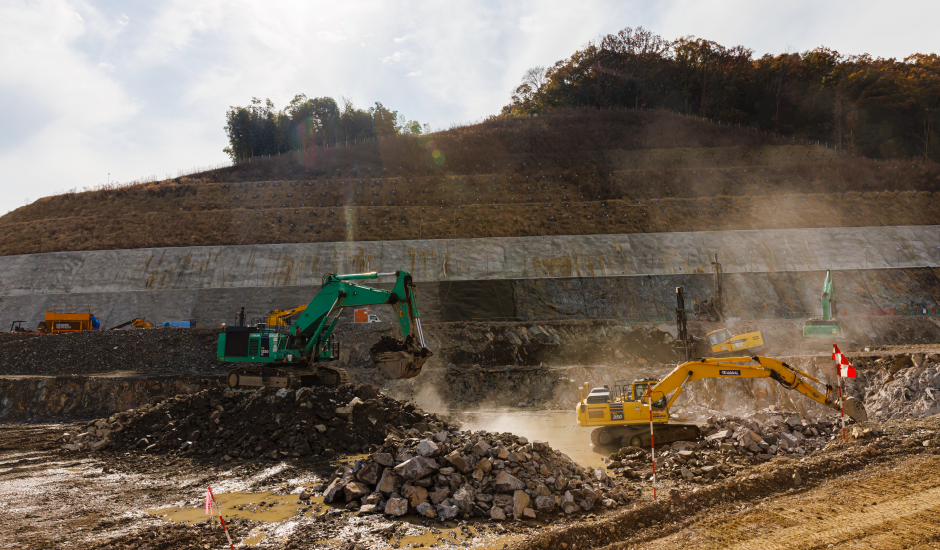 中野:この工事は、国土交通省中国地方整備局による「緊急治水対策プロジェクト」の一環で行われています。2018年の西日本豪雨の際に小田川と高梁川の合流地点で水かさが増し、高梁川の影響を受け、支流の小田川が増水したことで堤防が決壊するなどして真備町に甚大な被害をもたらしました。今後そういった災害を防ぐために立てられたのが、小田川の流路を変え、従来の合流地点を4.6km下流に切り替える計画です。当社は南山という山を掘削し、土砂を近くの柳井原貯水池に埋める作業を行うことで小田川の新しい流路をつくるほか、新しい堤防の基礎となる部分を担当。作業範囲は直線距離で1500〜2000mに及び、現在は半分程度まで進んでいます。同時に南山沿いにある県道も一緒に切り替えるため、その下地までを手がける予定です。
