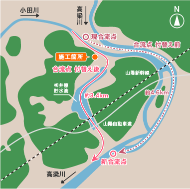 高梁川・小田川の合流地点では2018年の西日本豪雨で水位が上昇し、高梁川の影響を受け、支流の小田川が増水したことにより真備町に甚大な被害が発生。このプロジェクトは再度の災害防止のために柳井原貯水池を活用して2河川の合流地点を約4.6km下流に付け替えるもので、小田川の新しい流路をつくるために南山を掘削している。