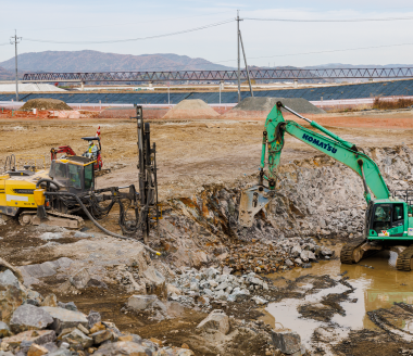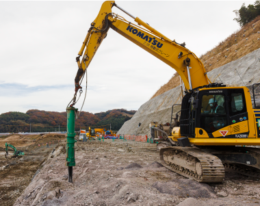 中野:今回は「スーパービッガー工法」と呼ばれる工法で岩盤の割岩作業を行っているのが特徴です。街中などダイナマイトでの発破ができない場所で用いられる珍しい工法です。作業を行っている南山は岩盤ばかりなので、岩を効率的に割ることができなければ作業のスピードが上がらず、機械の負担も大きくなってしまいます。