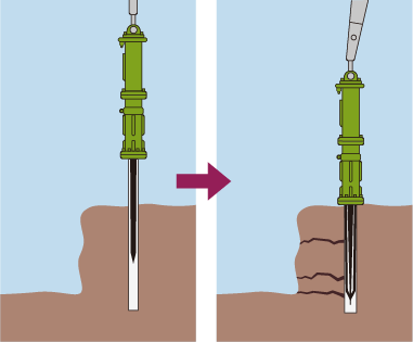 専用のビットで長い孔(穴)を開けた岩に「ビッガー」と呼ばれるくさびを打ち、油圧機械で高い圧力をかけて岩を破砕。直径127mmの孔に1700tもの圧力をかける。低振動・低騒音で行える工法のため、街中などダイナマイトによる発破が行えない場所で用いられることが多い。