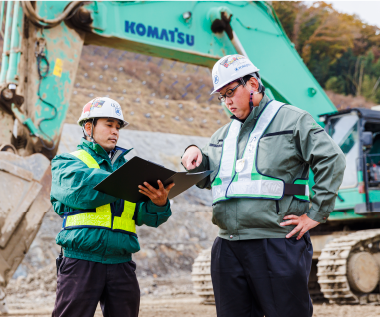中野:施工管理として、何より大切にしているのは安全です。日々現場を巡回し、問題があると感じた時は作業者に声をかけ、作業を止めるか異なる方法で進めるように指示します。その上で、大型重機の作業を効率的に進めるにはどうすればいいかを考え、時には元請け企業に掛け合って調整してもらうことも。さらにこの現場は、当社が掘削した後を追う形で他社が法面を整えていくため、必ず順番に作業しなければならないのが苦労している点です。そのため「ここを先に作業してほしい」「◯日までに終わらせて」など自社の作業者への的確な指示と、他社と作業の箇所やスピードを調整する力が求められます。私がこの現場に入ったのは着工後でしたが、周辺を少し歩くと水に浸かった跡があるなど、災害の爪痕を感じることもあります。できるだけ早く完了させ、住民の方々に安心していただきたいですね。