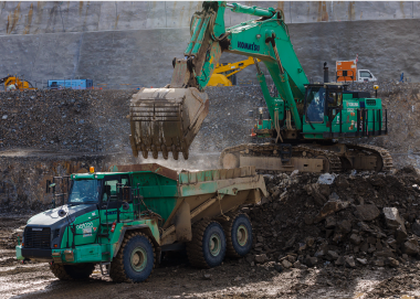 久保:さらに、国内でも数台〜数十台しかないレベルの大型重機を取り入れているのもこの現場の特徴です。バケット容量6立方メートル級のバックホーで破砕した岩や土砂をすくい、40tの重ダンプに積み込みます。重ダンプの積載量は20立方メートルで、10tダンプの3倍以上。これは公道を走れないほどの大きさで、現場での運搬のみに使われます。現場からは大量の岩や土砂が出るため、一度に多く積載できる重機を使うことで、できるだけ効率よく運搬できるようにしているのです。こうした大型重機は山奥で行うダム建設の現場などではよく使われますが、この現場のように街中の工事で使われるのは珍しいので、周辺にお住まいの重機好きの方がよく見ておられます(笑)。また、現場で働いているオペレーターより重機の数の方が多く、それぞれ掛け持ちで重機を扱っています。