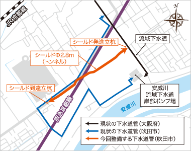 <吹田市公共下水道事業 岸部幹線整備工事第1工区>現状の吹田市の下水道管(青線)では大雨の際に雨水をすべて排水することが難しいため、大阪府が整備している都市計画道路十三高槻線の地下に、浸水被害の軽減を目的とした下水道管を整備。地下10mに直径2.8m・全長580mのトンネルを掘り進め、大阪府の流域下水道(黒線)に接続する。