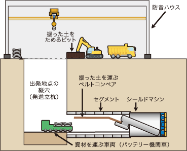 出発地点に「発進立杭」という縦穴を掘り、シールドマシンを設置。地中に向けて発進し、シールドマシンの前面にあるカッターで土を切り崩した後、その土をバッテリー機関車を使って運び、天井クレーンで地上に運び出す。掘った部分はセグメントと呼ばれる材料を組み立てて固定する。