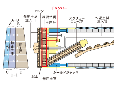 カッターで切り崩した柔らかい土にプラントで作った「泥」で圧力をかけ、崩れようとする地山とのバランスをとりながら堀り進みます。今回使用している直径2.8mのシールドマシンは現場の地盤(砂礫層)に合わせて特注で製作された。