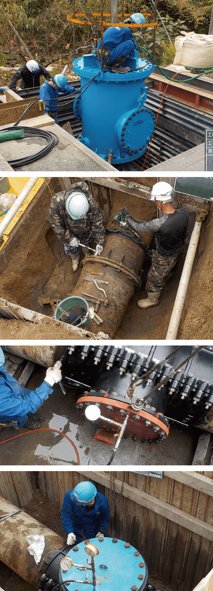 - 岡山県玉野市において、最初の布設から数十年が経過し老朽化した送水管を新しいものに切り替える工事。広範囲で行うため5〜6年の工期が必要となる大規模な工事で、2019年から順次進められている。
