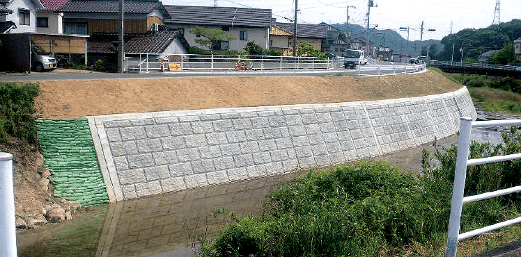 - 岡山県玉野市鴨川の護岸改修工事。集中豪雨での増水で崩落した護岸(200m)を改修した。