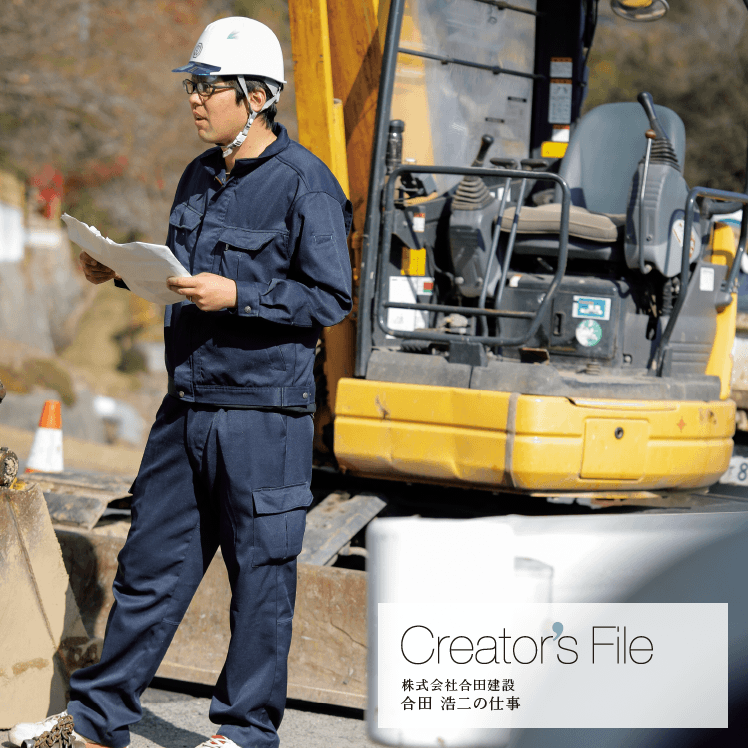 ゼネコンには3年ほど勤め、その後地元の岡山に帰って父が営む合田建設に入社しました。昭和40年に祖父が創業し、50年以上にわたり地域密着で上下水道の工事や堤防の補強、道路の改良などのインフラ整備や、災害復旧、宅地造成などを手がけている会社です。私は現在、老朽化した地域の送水管を切り替える工事を担当しています。工事全体としては5〜6年かけて行う大規模なもので、今回の現場はその一部分にあたる約5ヶ月間の工事です。施工管理として、まずは現場の安全を第一に自社の職人や協力会社の管理を行うとともに、工程や材料の管理などを行っています。他に大切なのが近隣住民の方々とのコミュニケーション。工事が始まる前には必ず近隣のお宅に挨拶に行き、工事の説明などを行ってスムーズに工事が進むよう心がけています。土木の仕事は、自分が手がけた構造物が目に見えてできあがっていく達成感と、それによって社会貢献できる点が魅力。特に当社は地域密着の事業が多いため、道路の幅が広がって地域のみなさんが安全に歩けるようになるなど、日々の暮らしが良くなることに役立っている実感があります。