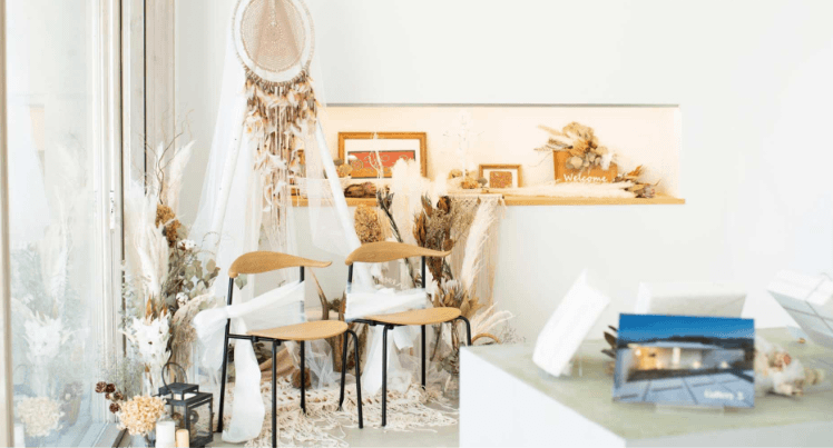 - 展示スペースなどに月替わりで季節の装飾を提案・設置。店内の雰囲気を考慮しドライフラワーを中心にアレンジしディスプレイ。