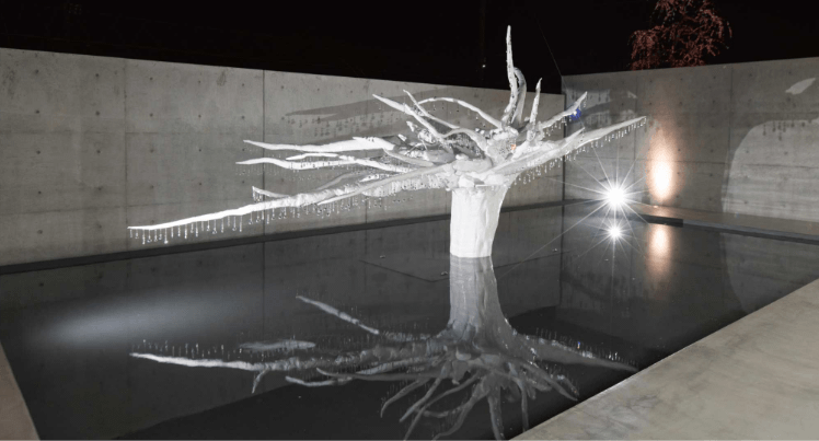 - 流木の根をウレタン加工で再現し、夜の水盤に映えるよう白に塗装。カットガラスを装飾し、昼は太陽の光、夜はライトの灯りが透過・屈折し楽しむことができる。