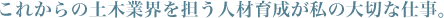 私は工業高校で土木に出合い、もともとものづくりが好きだったこともあって修成に入学しました。中学や高校までは多くの場合、限られた地区内での友人関係になりますが、修成で他府県出身の友人ができたことがよかったです。育った環境が違うため、発想も感性も違う。そこから視野を広げられたことが今でも自分の財産になっています。今では社内にも修成の後輩がいますし、現場で他社の人に会うと修成の卒業生だったいうこともあります。そうやってさまざまな人と関わり、協力会社さんや職人さんと一緒にものづくりができるのは本当に楽しいですよ。この現場でも、多い時には30人もの職人さんに入ってもらいますが、現在の土木業界は施工管理も職人の数も足りず、人数の確保に苦労しています。日本全国で上下水道や道路、橋などの老朽化に対応し、人々の安心で安全な生活を維持していかなければいけない時期がきていますので、若い人たちが日本の土木技術を受け継ぎ、活躍してほしいですね。そういった人材を育てていくのが、これからの私の大切な仕事だと考えています。