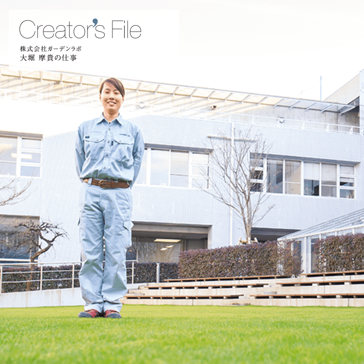 私が勤めているガーデンラボでは女性と男性の社員数は半々で、お互いに刺激し合いながら働いています。けれど、造園の世界全体で見るとまだまだ男性社会なので、これからは女性がもっと活躍してほしいですね。もちろん現場では石の移動や大型機械の操作など、力仕事が多いのですが、そういった場面では周りの男性の職人さんがフォローしてくれます。また、道具の使い方なども、ちょっとした工夫次第で、男性との体力差をカバーできることもあります。庭の彩りを考えてお花の配置を提案したり、花壇に植える花の組み合わせを考えたり、女性ならではの感性や視点を生かせる場面も多々あるんですよ。現場の掃除だって女性の方がすみずみまで丁寧に行っている印象がありますね、私は例外ですが(笑)。もしこの業界に興味があるなら、女性だからといって二の足を踏まず、思い切って飛び込んでください。新しく業界に入る方たちのお手本となれるよう、私は自分の得意分野である芝生の知識をさらに増やすとともに、木の剪定や花の手入れなどの技術も高めたいです。そして、自らの仕事を通し、世の中に緑をもっともっと増やしていきたいですね。 女性でも努力次第で活躍できますよ。私を見ればわかるでしょ(笑)。