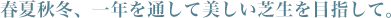 - 冬場に枯れる暖地型芝生の上から冬場に芽吹く西洋芝の種をまく「オーバーシード」という手法を採用し、1年を通して芝生を青々とした状態に保っている。