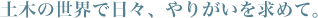 土木の仕事は、道路や橋、トンネル、電気やガス、上下水道など、人々の暮らしに欠かせないものづくりを担っているため、社会から必要とされ続けることでしょう。さらに、東京オリンピックの開催に伴う建設ラッシュにより、今後ますますの需要が見込まれています。しかしそれにも関わらず、この業界は深刻な若手不足に直面していて、現場を見渡すと40代から60代のベテランが目立ち、20代30代の人は少数派。人材確保に関しては、なかなか厳しい状況が続いていますが、「売り手市場」であることは若い人たちにとっては大きなチャンス。業界は今、若い力を求めていますから、新人の頃からガンガン現場に出て、国を挙げて取り組むような大規模なプロジェクトや面白い仕事に関わっていける環境があります。今なら、オリンピック関係の仕事もゴロゴロしていますしね。世界中の人が集まるスタジアムや選手村など、言葉にするだけで楽しくなるような仕事にたくさん関われます。土木の世界に興味がある若い人たちには、このチャンスに果敢に挑戦してものづくりの魅力を実感しながら、これからの業界を担う人材に育って欲しいと思います。