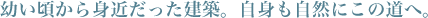 2020年に東京オリンピック・パラリンピックが開催されることが決まり、東日本大震災からの復興事業もあるため、この先、建設業界全体としては忙しくなるでしょう。でも単に選択肢の一つとして「就職先がありそうだから」というような理由で入って務まるような職業ではないと思います。ただ本当に建築やものづくりが好きな人にはできるだけ多く入ってきてもらいたいし、一つの場所に腰をすえて、じっくりがんばってほしいと思います。この業界は独立志向が強い人も多いですが、一つの案件を自分一人でできるようになるまではだいたい5、6年はかかります。その間に自分の強みや得意分野を見つけてほしいし、多くの人からいろいろなことを学んでほしい。自分の可能性を見出す前に事務所を変わったり独立したりして動いてしまう人が多いように感じるので、この業界をめざす若い方には「急がずにじっくり」がんばっていただきたいですね。