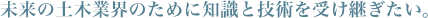 自然災害が頻発している日本において、土木業のニーズはますます高まっています。けれど、この業界は現在、人材の不足や高齢化という問題を抱えています。これからも厳しい状況が続くと思うので、今働いている若い世代を一人前に育て上げることが私たちの役目になってきますね。自分が知っていることは惜しむことなくどんどん引き継いでいきたいと考えています。学生時代の自分にも言ってやりたいことなのですが、この世界を志すみなさんには思いきり勉強してほしいですね。その中で得た知識や技術は何一つ無駄になりません。すべてが将来の武器になるはず。たとえ、業務で直接役に立たなかったとしても、お客様や社内の人と会話をする際に必ず活かせます。地域の人たちの生活を支え、社会基盤を作る土木業の未来を一緒に盛り上げましょう。 先輩が僕を育ててくれたように、僕も次の世代を育てたいですね。