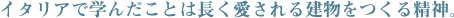英之 イタリアでは建築士として学ぶことがたくさんありました。その中で最も感銘を受けたことは、イタリアでは古い建物ほど価値があり、大切にされているということです。ミラノやフィレンツェといった大都市でも、築何百年という建物がたくさん残っていて、実際、私たちが住んでいたアパートは築400年を超えるもので、当然、最新の設備が搭載されているわけではありませんでしたが、石造りで断熱性が高く、四季を通して快適に暮らせました。このような、良いものをつくり長く大切にするイタリアの精神は、私たちの「ずっと愛される建物をつくる」という使命につながっています。