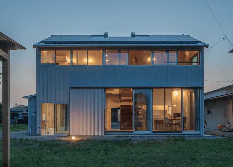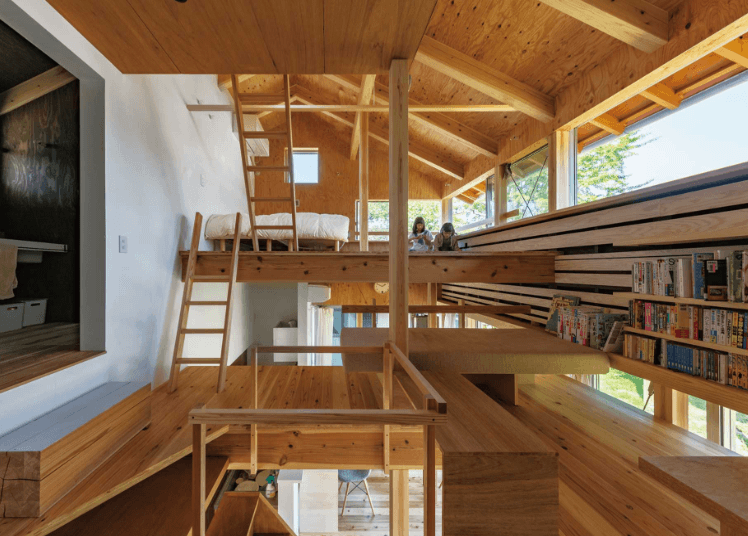 - 野原の中にたつ家。家族同士がどこにいてもつながりたい、野原や隣の大きな樹と暮らしたいという要望をスキップフロア形式で設計した。
