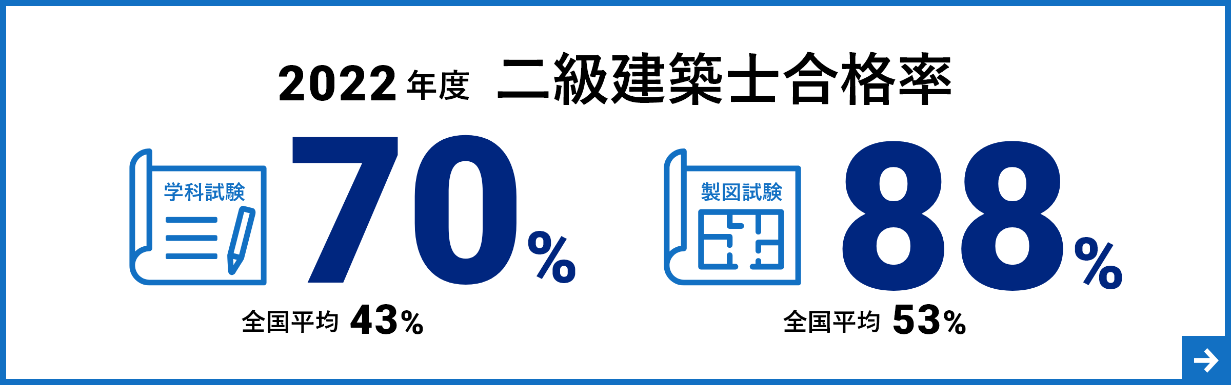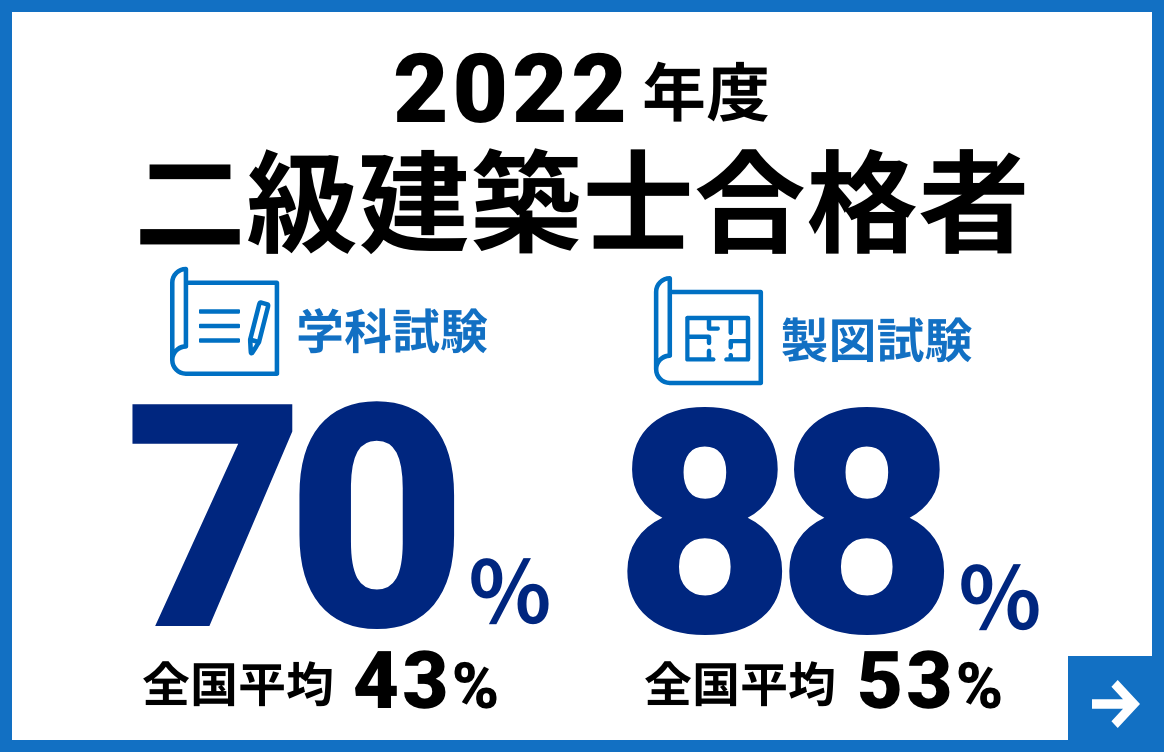 二級建築士の合格を目的とした「専科2級建築士科」では、基本・演習・復習を繰り返す独自のカリキュラムで、合格に必要な力をより確実に修得できます。2024年度の試験では、全国平均を大きく上回る学生たちが合格しました。