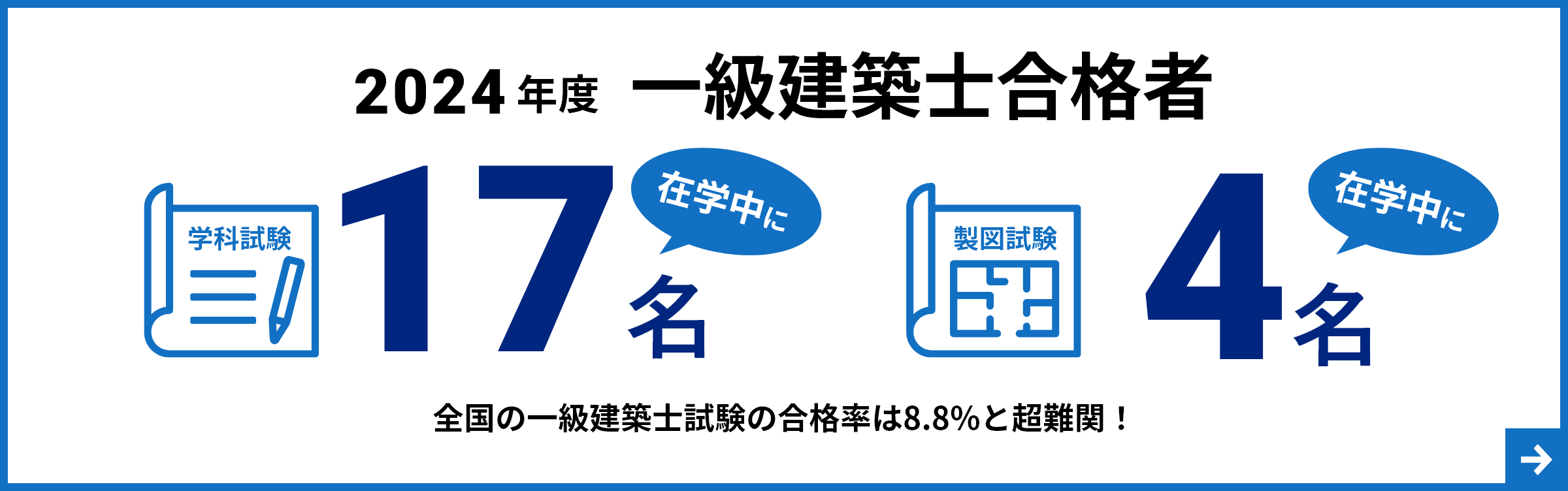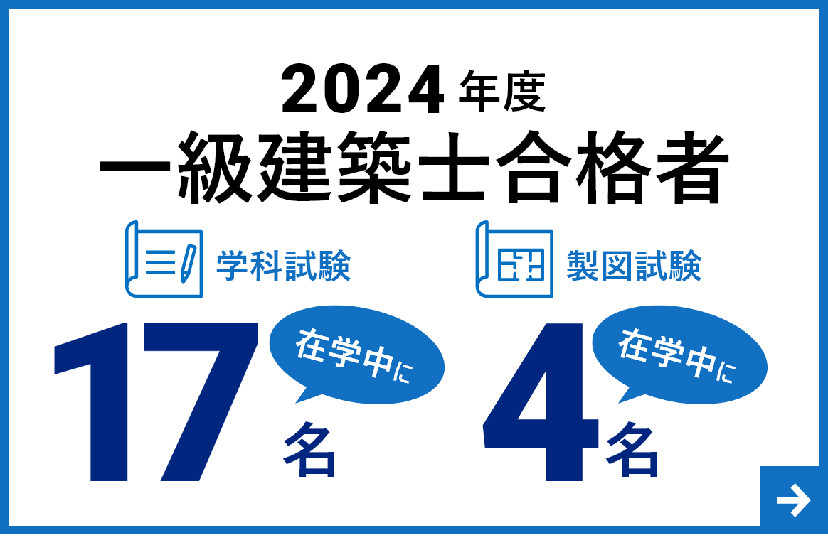 「一級建築士受験資格認定校」である修成では、2021年度より「専科1級建築士科」を設置。2024年度は学科試験17名、製図試験4名の合格者を輩出しました。効率的かつ綿密な学習により、一級建築士試験の合格を実現します。